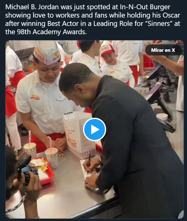 Tras ganar el premio a Mejor Actor, el intérprete fue captado en un restaurante de In-N-Out Burger cercano al teatro, donde celebró su victoria con una bandeja de hamburguesas, papas fritas y bebidas.