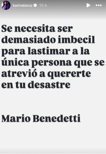 La cantautora citó una frase del célebre escritor uruguayo Mario Benedetti que dice: "Se necesita ser demasiado imbéc*l para lastimar a la única persona que se atrevió a quererte en tu desastre", citó Karina.